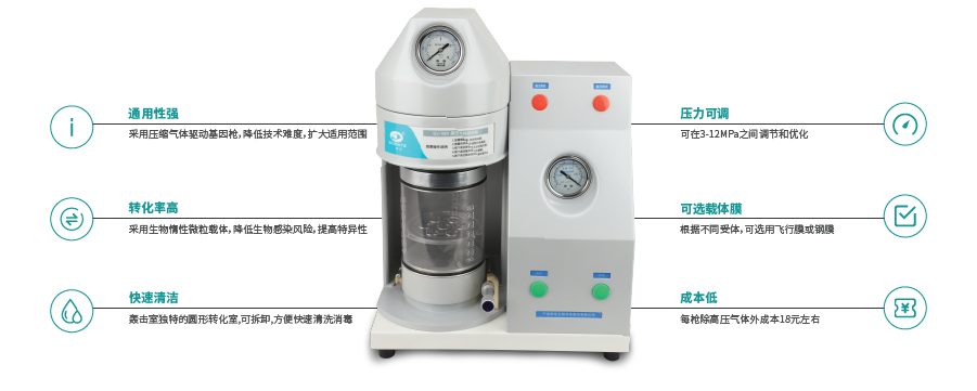 ? 通用性強 采用壓縮氣體驅(qū)動基因槍,降低技術(shù)難度,擴大適用范圍